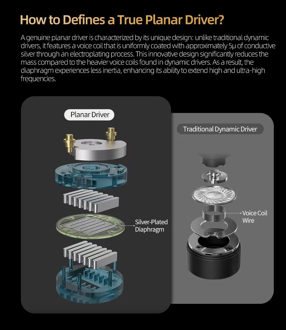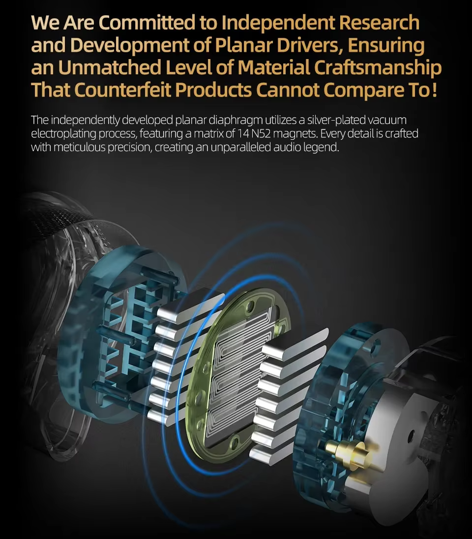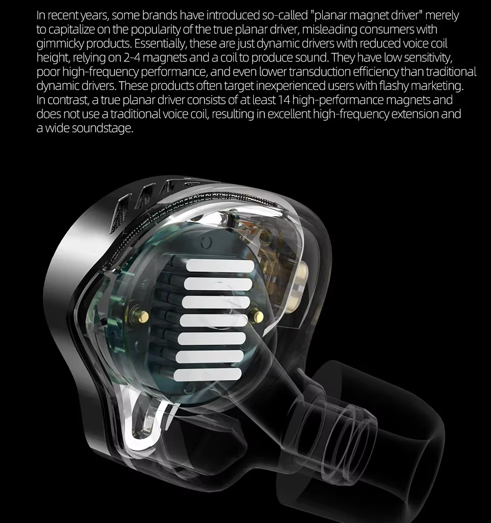 En los últimos años, algunos conductores han sido etiquetados como "planar" pero difieren significativamente de la verdadera tecnología plana. Un controlador plano genuino está diseñado con al menos 14 imanes de alto rendimiento y funciona sin una bobina móvil tradicional, lo que resulta en una extensión excepcional de alta frecuencia y un amplio escenario sonoro. A diferencia de los controladores dinámicos tradicionales, un verdadero controlador plano presenta una bobina móvil galvanizada uniformemente recubierta con aproximadamente 5 μ de plata conductora. Esta innovación reduce significativamente la masa y la inercia, permitiendo que el diafragma extienda frecuencias altas y ultra-altas con mayor precisión.
