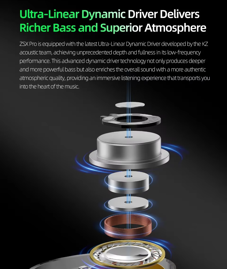 Está equipado con el último controlador dinámico ultralineal desarrollado por KZ, logrando profundidad y plenitud sin precedentes en sus bajas frecuencias.